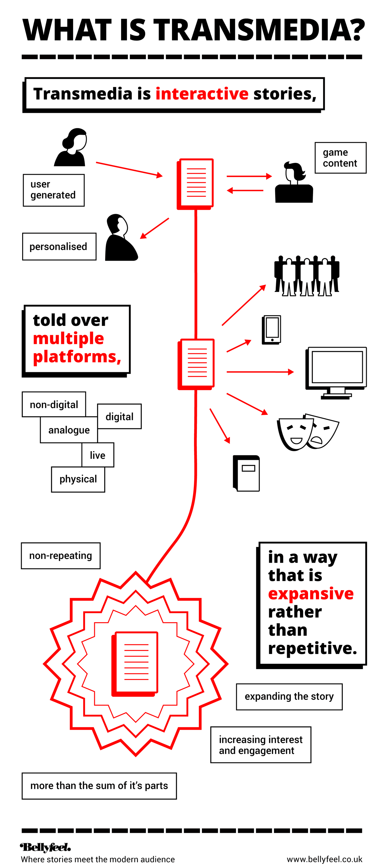Transmedia storytelling representa um processo, onde os elementos integrantes de uma ficção se dispersam, sistematicamente, por vários canais de entrega, com a finalidade de criar uma experiência de entretenimento unificada e coordenada.